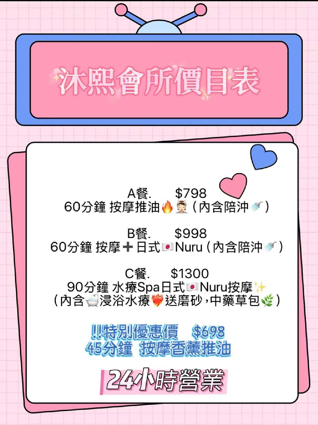 A餐. $798 (60分鐘) 按摩推油 (內含陪沖) B餐. $998 (60分鐘) 按摩+日式Nuru(内含陪沖) C餐. $1300(90分鐘) 水療Spa日式+Nuru按摩55 (內含浸浴水療送磨砂,中藥草包)!!!! ~!~!特別優惠價 $698 (45分鐘) 按摩香薰推油~!~! 24小時營業 (歡迎骨友) (歡迎預約) (歡迎早客) 其他: